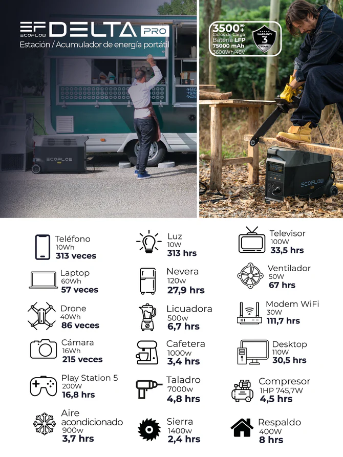 - Vida Útil: 3500 ciclos de carga y descarga al 80% de capacidad Batería extra: Soporta hasta dos DELTA Pro Smart Extra Battery/Smart Generador