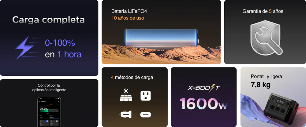 Descubre la Estación de Energía Portátil EcoFlow RIVER 2 Pro 768Wh: ligera, potente y carga rápida. Con 11 salidas, su capacidad de 768Wh y salida de 800W te garantizan energía duradera. Recarga 0-100% en solo 70 min, 5x más rápido. Batería LFP segura por 10 años. Certificación TÜV Rheinland. X-Boost de 1600W para electrodomésticos. Carga a través de AC, carro, solar y USB-C. Pesa solo 7.8kg. Interruptor EPS <30ms. Controla con app vía Bluetooth o Wi-Fi. ¡Imprescindible para tus aventuras!